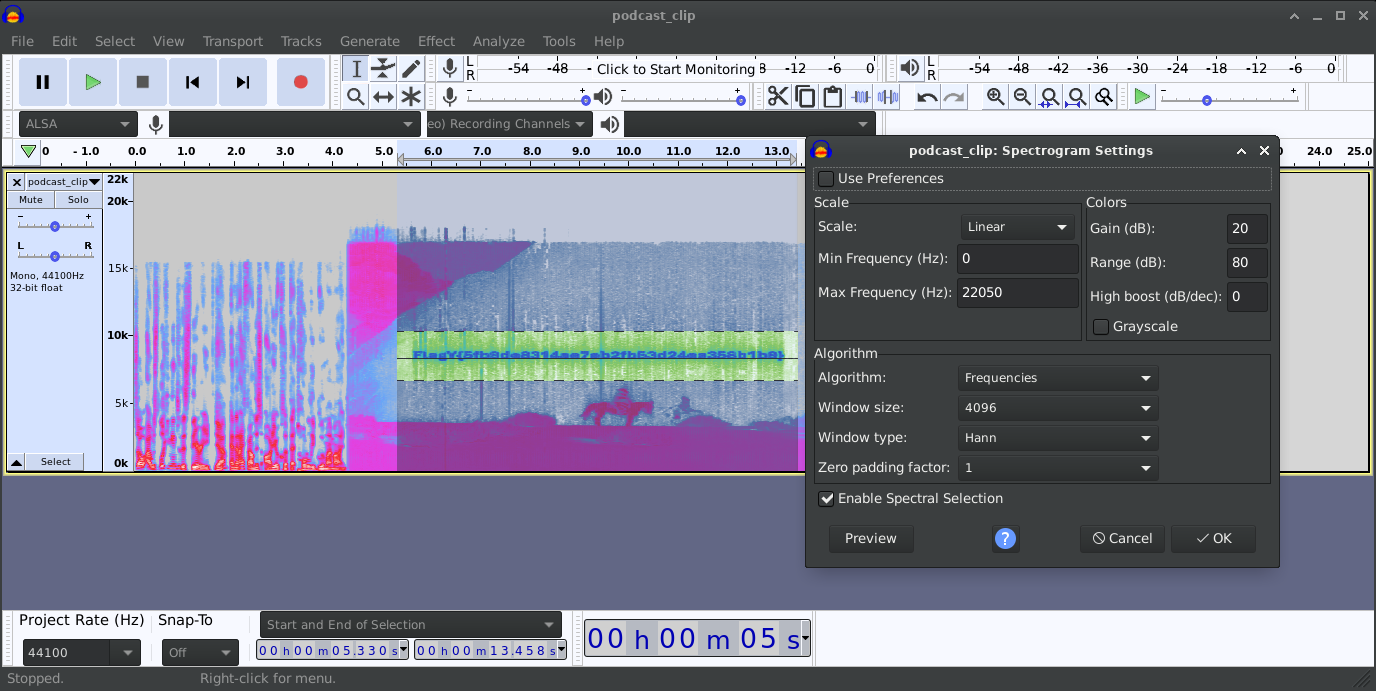 - Click the track name (podcast_clip) → Spectrograms → Spectrogram Settings…